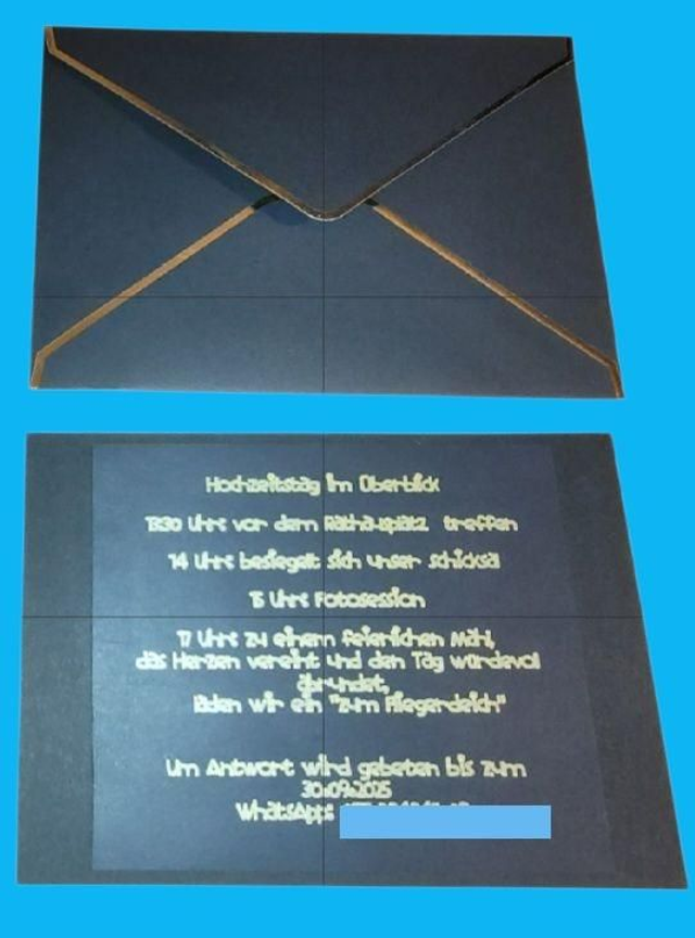 Farbe: Schwarz, Schrift Gold, detail Blatt 10x15 cm, zusatz Blatt 13x18cm passend zum Briefumschlag.